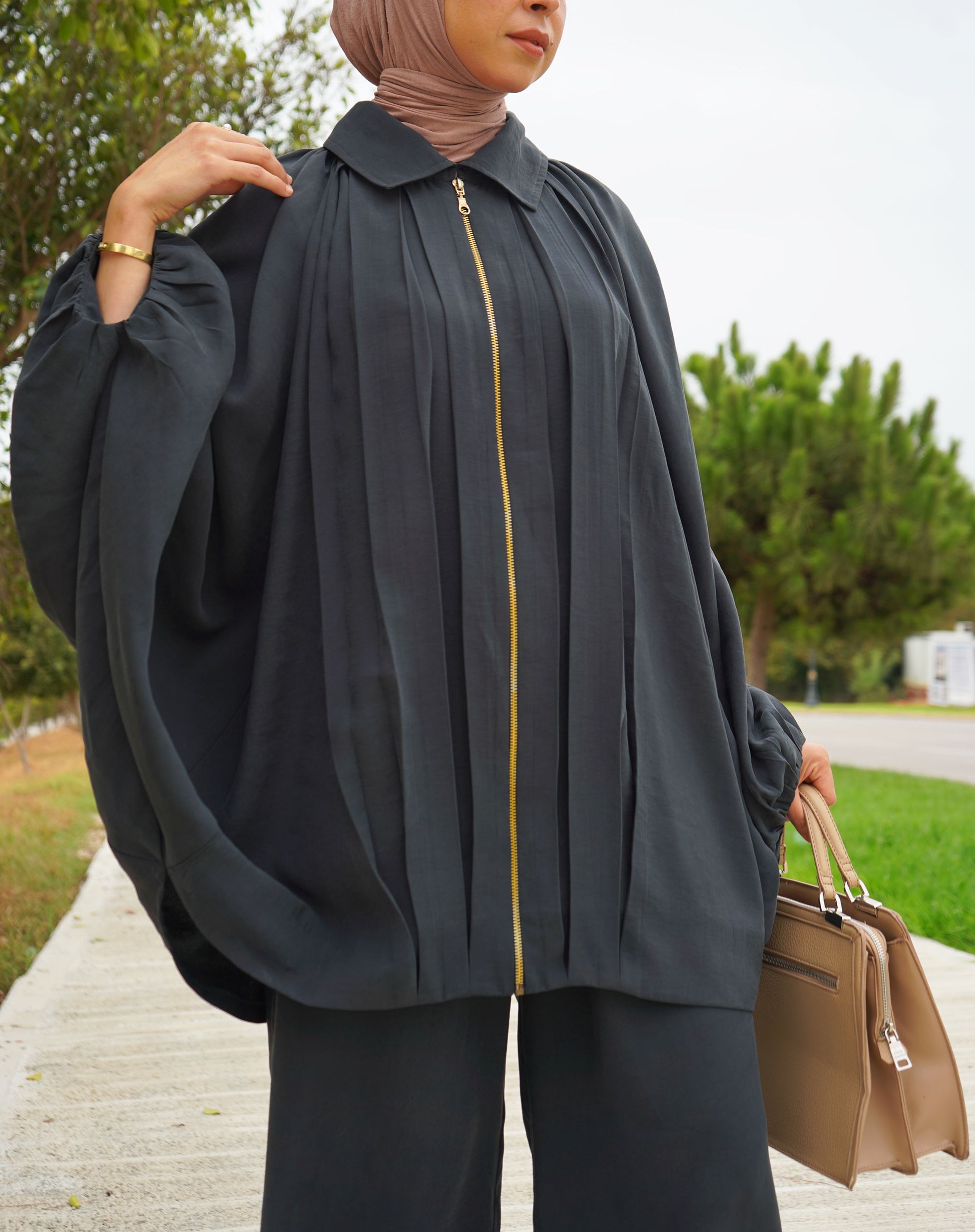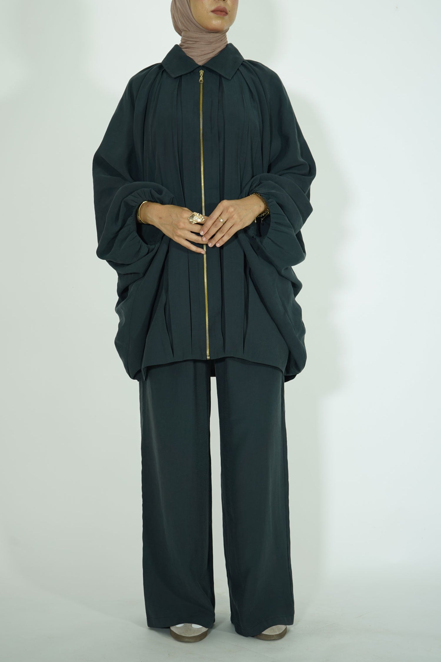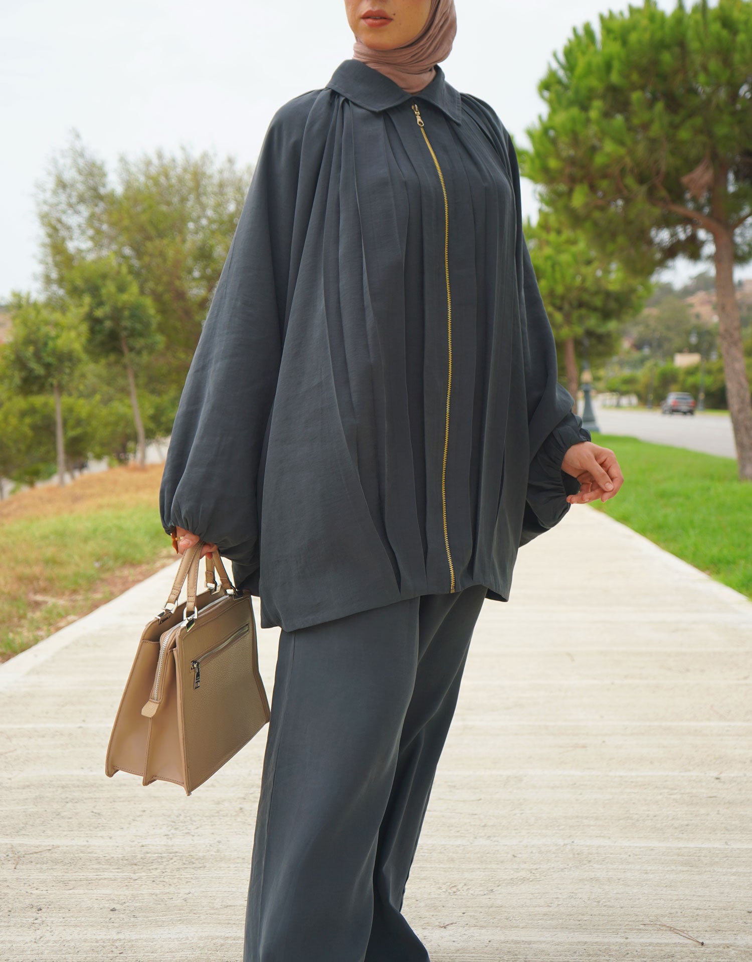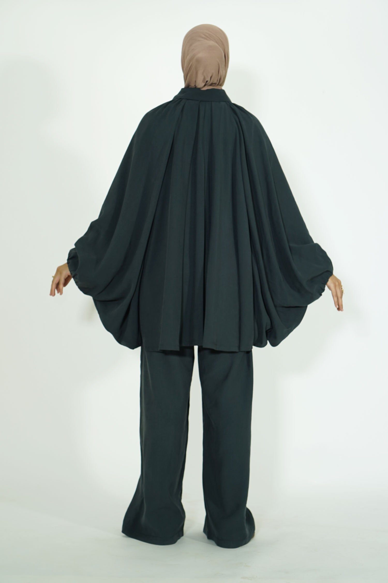 Coupe : Haut papillon fluide + pantalon oversize confortable.